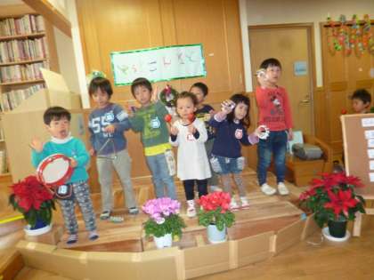 昨日,5歳児のお兄ちゃんがお部屋まで焼き芋を届けに来てくれ,2階に焼き芋屋さんがあることや,コンサートをしていることを教えてくれました。「なんだか楽しそう!」そんな思いをもって今日は2階のお店へ行ってみることにしました!お買い物のカゴを持って階段を登っていくと...コンサートの舞台があり,ちょうどコンサートが始まるところでした。5歳児のお兄ちゃんお姉ちゃんの演奏を聴いたり,一緒に色々な楽器を鳴らさせてもらったり。とても楽しいコンサートでした!コンサートが終わると「ゆり組にもお店屋さんがあるよ!」とお兄ちゃんが教えてくれたので行ってみることに。ゆり組にはクッキー屋さんやドーナツ屋さん,くじ引き屋さんなど楽しそうなお店がたくさん並んでいました!お兄ちゃんお姉ちゃんと「いらっしゃいませ!」「これください!」などのやりとりを楽しんだり,買ったものを嬉しそうに買い物カゴに入れるかわいい姿がありました。