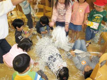 1階のホールでシュレッダーの中の紙を出して遊んでいます。誰が言い出したのか「もけもけ」らしいです。雪を降らせたり、体に巻きつけたり、ぎゅうっとおだんごにしたり、蹴飛ばしたり・・・・。いろいろ試しています。Cちゃんは上からみんなでお布団にしてもらっていました。素材での遊び、幼稚園でいっぱいしたい遊びの一つです。また明日も続くでしょうか?入れ替わりいろいろな子どもが参加していくことでしょう。