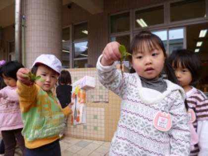 お弁当はツリーを見ながら食べることにしました。今朝,収穫したみんなのラディッシュを塩もみと塩ゆでにしてもらい味わいました。赤いラディッシュと緑の葉っぱがとてもきれい!そっと口に入れると…「おいしいね」「ちょっと苦い」の声が聞かれました。