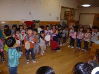 今日はツリーの近くでみんなでコンサート気分で楽器遊びをしました。「クリスマスの歌が聞こえてくるよ」の曲に合わせて好きな楽器を鳴らすクラス,お客さんになって一緒に歌いながら聞いているクラスと交代しながら遊びました。最後は2クラス一緒に「ジングルベル」の曲で,体を揺らしながら楽しみました。サンタさんにも聞こえたかな?