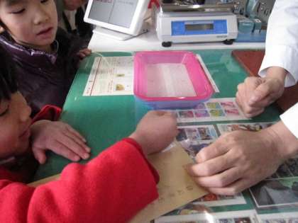 こどもたちが風船のお便りにお礼の返事を出しました。3歳児2クラス4歳児2クラスで4通、残りは5歳児2クラスで担当しました。担任と一緒にクラス毎に考えて様々な手紙ができました。明日の終業式を前に年長児が、近くの郵便局へ出しに行きました。数人ずつを連れて一緒に行きました。ポストや切手のこと、郵便の仕事の話等を話して聞かせました。封筒を量ってもらったり、切手代を払ったりお釣やレシートをもらったりして切手を貼って投函しました。本物の体験でどの子どもも神妙に集中していました。郵便局の職員の方が8回も同じようにして子どもが行ったのに毎回丁寧に対応してくださいました。温かい気持ちがいっぱい詰まった手紙になりました。本当にありがとうございました。