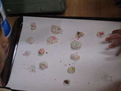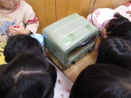 3歳児が12月の誕生会に大きい組の真似をして小さな煎餅?を作りました。ほんの一握りの米粉分でしたが、飾りつけをしてオーブントースターで焼きました。口に入れるととろける柔らかさで、ふんわりクッキーのような具合です。アレルギー体質の子どもに配慮しながら一緒に楽しい経験をと先生たちは試行錯誤しています。今日の出来はどうだったでしょうか?きっと先生達が試作した時のよりは子ども達の楽しい思いがいっぱい詰まっておいしかったことでしょう。ごちそうさまでした。