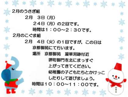 なお,2月4日のこぐま組は,下記のように京都御苑で行います。