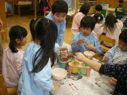 年長組の保育室では,お抹茶茶碗の絵付けが始まりました。
