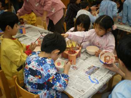 子どもたちの前に,素焼きのお抹茶茶碗が並びます。一人一人が自分の茶碗に,好きな色を使って思い思いの絵をかいていくのです。