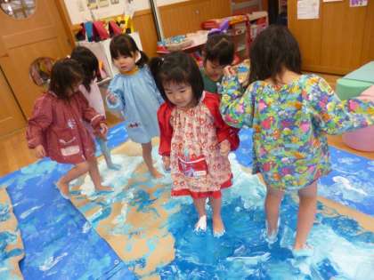 暖かくなったり寒くなったりと気温の変化が激しいですが,まだ2月。土曜日に雪が降りました。3歳の子どもたちは園庭に少し残った雪を集めて,砂場のごちそうの上に乗せて「お砂糖をかけるよ〜」「かき氷だよ」など雪を砂糖や氷のイメージをもって遊んでいました。保育室でも絵の具遊びの中で,「氷や〜」「つるつる滑る〜」手足にたくさんの絵の具をつけて「ペンギンになっちゃったよ〜」と言いながらイメージをもち楽しんで遊ぶ姿が見られました。