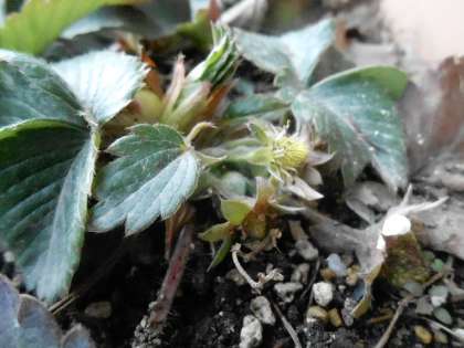 3枚目は,イチゴです。5歳児が一人一鉢で育てていますが,この写真は毎年育てている苗です。何年も冬を越して,毎年実をつけています。今年も花が咲いて,イチゴの実をつける準備をしているようですよ。