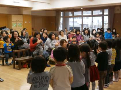 3歳児もも組・ちゅうりっぷ組の手遊び歌では,お家の方と一緒に手遊びをして楽しむ姿がありました。