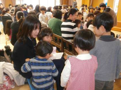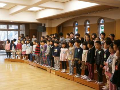 いつもなら3・4・5歳児の順に発表することが多いのですが,今日は4歳児が最後でした。それは,今日の半日入園の子どもたちが入園してきた時に,今の4歳児がいちばん大きなお兄さんお姉さんとなってお世話をしたり,頑張ってくれたりするからです。