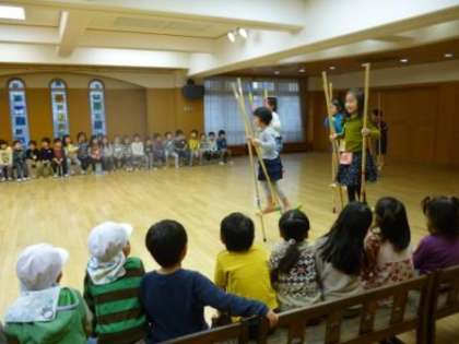 一緒にやりたくなった3歳児が,自分の竹ぽっくりを持ってきました。