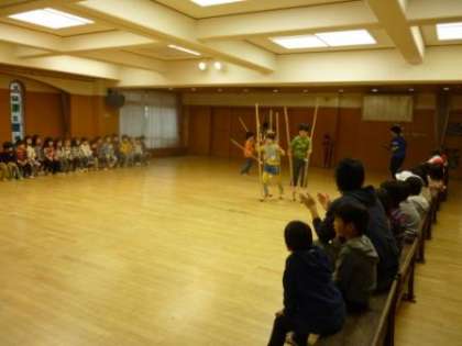 と声援を受けて,5歳児の子どもたちは大張りきりです。
