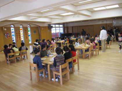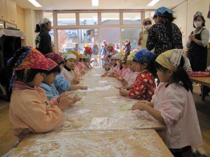 寒い日でしたが太陽に恵まれ、晴天の中恒例の餅つきをしました。幼稚園の行事ですが、大勢の大人の手を借りての実施です。今年はお母さんが31名、おやじの会が7名きてくださいました。先生を入れると大人は50人を超えます。私が当園に来て4年目、年々保育参加の保護者の熱気に圧倒されるところです。今年も40キロの餅をつきました。手際よく進めていただき12時前に全部片付けも終わりました。本当にありがとうございました。子ども達は杵でついたり、暖かい内にまるめたり、お餅レストランで食べたり、お餅つきを楽しみました。伝統的な行事を幼稚園で受け継いでいくことが大切なことを改めて実感しています。思い出に残るお餅つきになりました。皆さんありがとうございました。