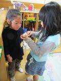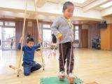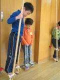 5歳児が竹馬に乗ったり,投げごまをうまく回したりするのを見て「すごいな〜,かっこええなぁ〜」と言っていた4歳児。遊戯室で竹馬に乗っている5歳児と一緒に,4歳児も一本歯げたを始めます。竹馬の5歳児の姿に憧れを感じている4歳児,そんな4歳児の一本歯げたを心配そうにそばで見守る5歳児の温かいまなざし。一方では4歳児にこまのひもの巻き方をていねいに教えている5歳児もいます。遊びを通して生まれた心の触れ合いを嬉しく思いました。