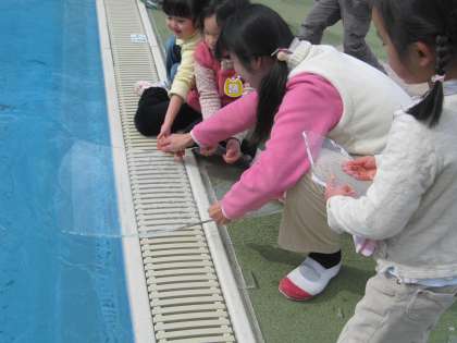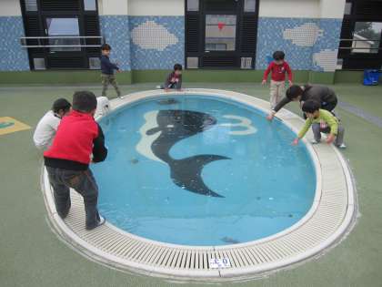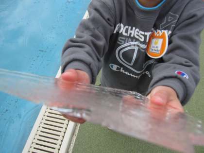 1月14日屋上のプールに氷が張りました。「でっかい!」「ぶっとい!」大感激で表面を叩いて確かめたかと思うと、早速取っていきます。はまらないでねと大人の心配をよそに、次々と「ゲット」していきます。厚さが5ミリ程、何とか階下の友達に見せたい、知らせたいと知恵をしぼる子ども、「これやったら、プールで泳げなくなっちゃう」と夏のことを心配する子ども、日ごろは友達を見ていることの多い子どもが動いて笑っている姿、いろいろなかかわりが見られたひとときでした。やっぱり冬は冬らしいのがいいですね。自分達でも氷つくりをしてみようとする子どももでてくるでしょうか?