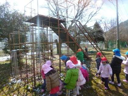 少しずつお日様も出てきたので散策に出発です!雪が積もっている様子を見たり,葉っぱや木などの自然に触れたりして遊びました。すると,雪も止み,他学年とかかわり合いながらだるまさんがころんだや追いかけっこをして楽しみました。先週から他学年とピクニックを楽しんで一緒にお弁当を食べたりしました。