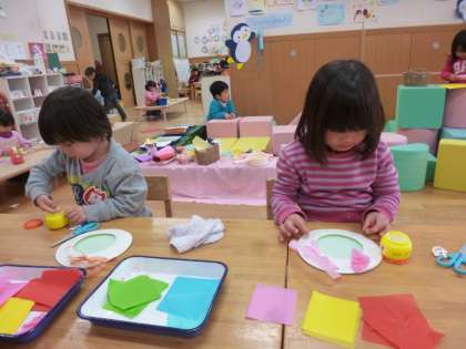 3,4歳児の部屋では,5歳児のお兄ちゃんお姉ちゃんにありがとうの気持ちを込めて,プレゼントをつくっています。早く渡したくてうずうずしていますが,もう少し内緒にしておいて,またプレゼントする日を楽しみにしたいと思います。