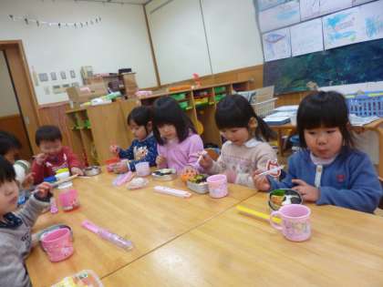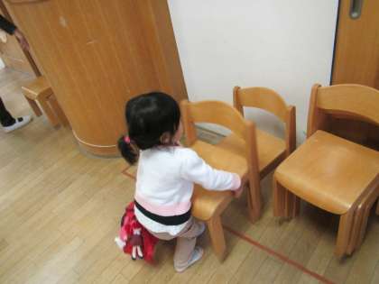 そこで今日は,4歳児の保育室を借りて,お兄さんお姉さんになった気分でお弁当を食べさせてもらいました。いつもより大きな机,重たい椅子を「いつもと違うかんじ」「大きい椅子やなあ」と言いながら嬉しそうに運んでいました。あと1か月程すると,今は大きく感じている机も椅子も,きっと自分達の物になってくるのだろうなと思います。