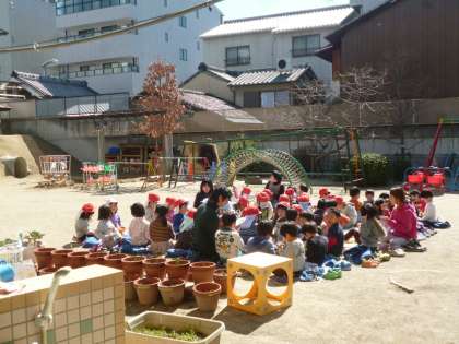 朝,登園して帳面にシールを貼るとき「3月終わったら,もう次のページないなあ」「もうすぐ大きい組さんになるねん!」と嬉しそうに話す姿が多くみられるようになってきました。「みんなが大きい組さんになったら咲くんだよ」と言いながら楽しみに植えたチューリップもぐんぐんと大きくなってきています。
