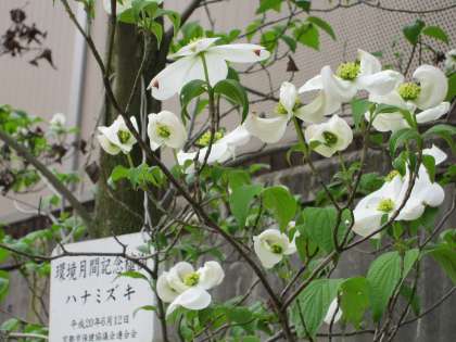昨年の環境月間に園庭に白いハナミズキを植樹していただきました。隣に赤いハナミズキがあり、創立10周年の今年には紅白で咲いて欲しいと願っていました。植樹の時期が難しく夏場の水遣りに苦労し、茂らない葉の心配をし、枯れてしまったのではないかと危ぶんだり、開花までずっと心を寄せていました。冬を越して春先から木の芽が目に付くようになってみんなで安堵し喜びました。自然の力のすばらしさを感じます。直ぐ前のブランコに乗った子どもを見下ろすとともに、幼稚園中で一番背の高い木としてみんなを見守ってくれています。