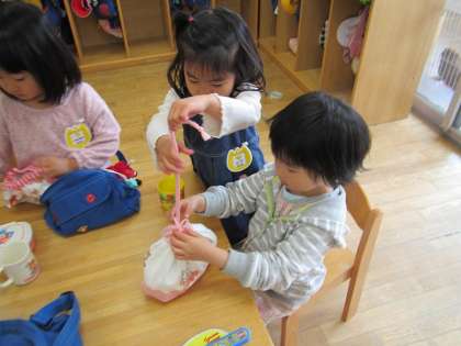 5歳児の子どもたちは,1階の保育室から2階の保育室に変わり,階段を上って行く姿や表情がとてもカッコよく感じられます。入園してきた3歳児の保育室を覗きに来てくれ,泣いている子どもがいると「大丈夫だよ」「お母さんすぐ迎えに来てくれはるで」と励ましてくれています。今日からお弁当がスタートしましたが,新級記念にもらったお弁当包みなど,自分でくくるタイプの入れ物に挑戦している子どもたち。見せ合いっこしてなんだか嬉しくってニコニコ。