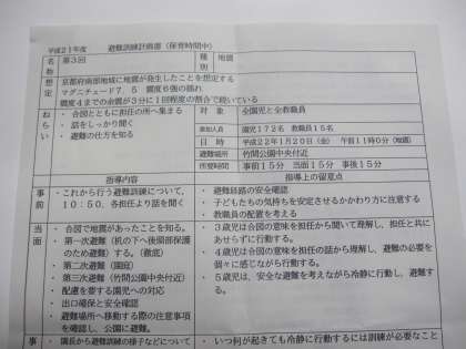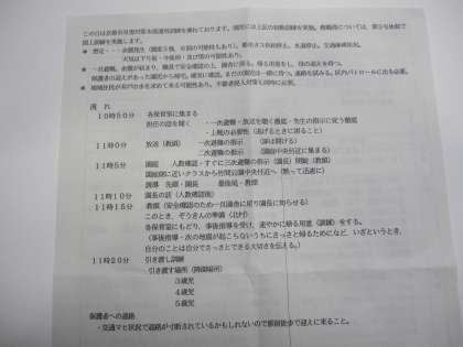 昨日地震発生を想定した避難訓練を実施しました。竹間公園での子どもさんの引渡訓練では、抜き打ちでしたが、保護者の方にご協力いただき、子ども達も不安を大きくさせることなく、参加していました。ハイチでの大震災の様子をテレビや新聞で見聞きしている子どももありました。教職員一同いざと言うときの備えについて更に身を引き締めて取り組んでいきたいと思いました。今後ともよろしゅうおたのもうします。
