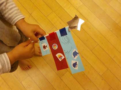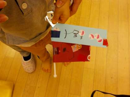 そして,こいのぼりも作りましたよ。お家の人と一緒にシールを貼って,みんなそれぞれ,素敵なこいのぼりの出来あがりです。シールの貼り方一つでも,それぞれ違って,本当にかわいいこいのぼりたちでした。
