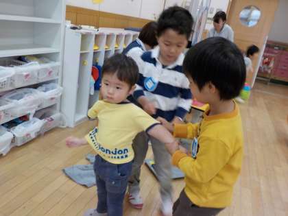 3歳児も,お兄ちゃんお姉ちゃんのおかげで安心して過ごすことが出来ました。終わった後はそのまま一緒に保育室の積木や園庭のブランコで遊ぶ姿も見られました。