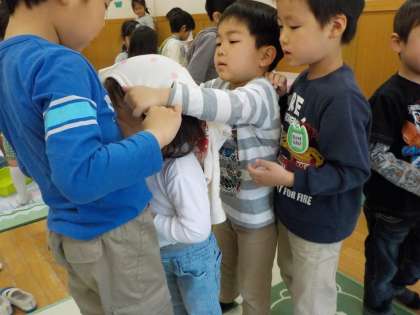 3歳児は初めての発育計測です。ちょっぴりドキドキしている子どももたくさんいましたが,そんな3歳児の子どもたちのもとに,優しい5歳児のお兄ちゃん,お姉ちゃんが手伝いに来てくれました。「大丈夫だよ」「服脱がしてあげるよ」「手つなごう」「こっちだよ」など言いながら,一生懸命励ましたり,手を添えて安心できるようにかかわったりしてくれました。5歳児のかかわりを見て,大きくなったなぁ,頼もしいなぁ,とこちらも嬉しい気持ちでいっぱいになりました。今の5歳児も,3歳のときに同じようにお手伝いをしてもらっていました。してもらったことは子どもたちの心にきっと残っていますし,そうした経験を大事にしたいと思いました。