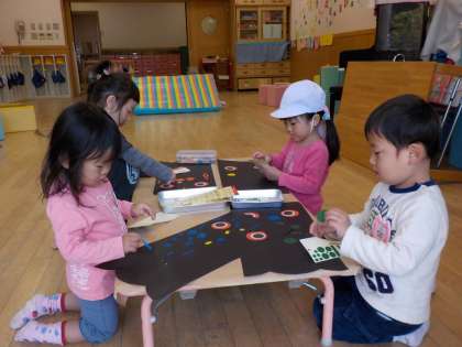 3歳児は,シールをペタペタと貼ったり,クレヨンでぐるぐる模様を描いたりしました。