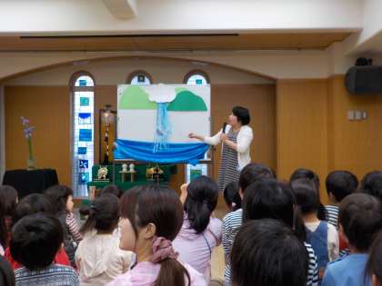 もうすぐこどもの日。今日幼稚園では,幼稚園のみんなで集まって「こどもの日のつどい」をしました。こどもの日の由来を聞いたり,「こいのぼり」の歌を一緒に歌ったりしました。鯉が龍になる場面では,3歳児の子どもたちも「うわぁ〜」と声があがりました。