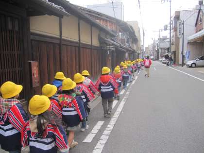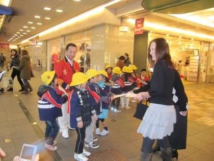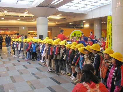1月26日(火)ゼスト御池(河原町広場)で、京都市消防音楽隊防火ふれあいコンサートがありました。中京もえぎ幼稚園幼年消防クラブの年長児が賛助出演しました。消防の法被を着て、幼稚園から歩いて会場へ行きました。道中では「火の用心」と掛け声をかけながら行進すると街を行く大勢の人が注目してくださいました。河原町広場では音楽隊の大人の人と一緒に防火のチラシを配りました。演奏会では間近に音楽隊の演奏をきいたり、「崖の上のポニョ」を歌ったりしました。保護者の方も観にきてくださり、幼年消防クラブの楽しい活動の時間になりました。中京消防署の皆様お世話になりました。今後ともよろしゅうおたのもうします。