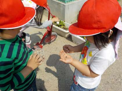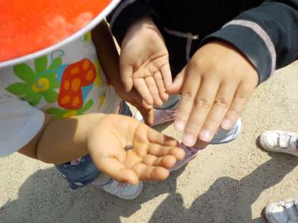 手のひらに乗せて,お散歩の様子を見たり,「お団子,コロコロになった」と丸くなったダンゴ虫に目を輝かせてはしゃいでいました。
