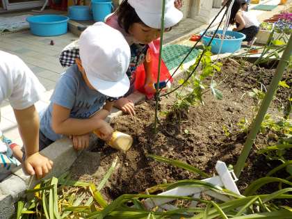 畑の土を掘り起こしてみると,かわいいダンゴ虫を発見!!「先生,コロコロしているよ」「かわいいでしょ,見て見て」たちまち子どもたちの大人気になりました。学年を問わず,友達が集まってきて,「どこにいるの?」「ここの土にいたよ」みんなでダンゴ虫探しが始まりました。