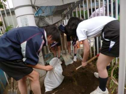 午前保育だったので,午後は先生と一緒に子どもたちが栽培に使う土の準備です。「幼稚園の時ここで遊んでたね」と幼稚園の頃のことを思い出したり,土から出てくる幼虫に「ワ〜!」と声を挙げたりしながら,楽しい雰囲気で大活躍の皆さんでした。