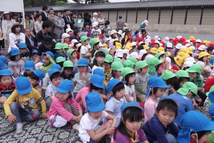 5月15日は京都の三大祭りの一つの葵祭の日でした。京都市立幼稚園の5歳児は,例年京都市教育委員会のご厚意で行列のスタートとなる建礼門の所に京都市立幼稚園児の観覧席を設けていただいています。