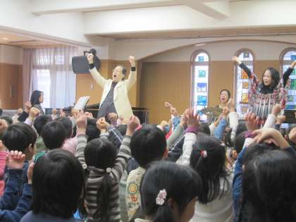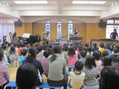 声楽家山本禎二さんの「ももいろペリカンときらきら星」の音楽鑑賞教室がありました。近くの待賢幼稚園の園児と合同の鑑賞で、4,5歳児が中京もえぎ幼稚園の遊戯室に集まりました。ピアノ、ドラム、フルート、マリンバなどの楽器演奏を間近で聴きました。クラシック音楽や童謡が次々に演奏され、知っている曲のところでは、元気な声で一緒に歌ったりもしました。「おててつないで」等このごろでは歌う機会の少なくなった歌もゆっくり教えてくださいました。親子で歌いたい歌がたくさんあるなと改めて思う機会になりました。伝えていくことの大切さも感じました。幼稚園でも歌っていきたいなと思いました。ありがとうございました。