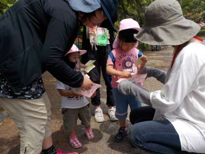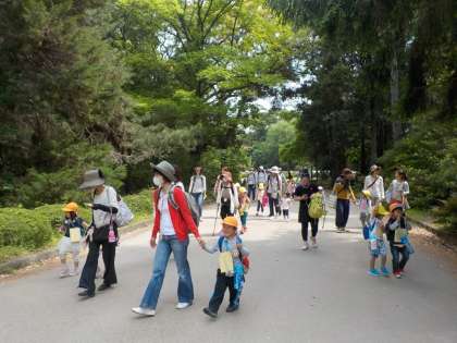 今日は心配だった天気にも恵まれて,全学年で植物園に親子遠足に出掛けました。子ども達は毎日,♪探検に行こうの歌を歌って,この日を楽しみにしていました。歌を歌いながら,弁当をもって,水筒を持って,リュックを持って,しゅっぱーつ!親子でワクワクしながら,植物園の中を探索しました。昨日配った『植物園へ探検に行こう』のカードを首からぶら下げて,各ポイントを探してシールを貼っていきます。バラやシャクヤク,ハスなどのきれいな花もあれば,水琴窟に行って素敵な音を聞いたり,水車がくるくる回っている様子を見たりして,とても楽しかったです。5歳児は,自分達で地図を見ながら「次はこっちだ」「あっちに行ってみよう」とどんどん進む姿がありました。3歳児は初めての遠足でワクワクドキドキしながら,おうちの方と楽しく進んでいました。4歳児はお家の方と一緒に,「次はここに行こう」「先にこっちに行こう」など話しながら進む姿がありました。