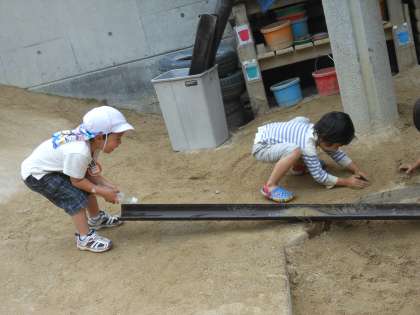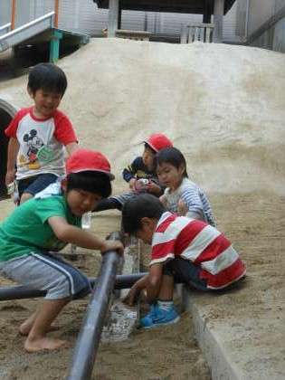 砂場の大きな山のとなりでは,川がつくり始められています。トイをつなげて5歳児と4歳児が一緒につくっています。「こっちから水入れるよ」「待って,まだ繋がってないから」「もういいよ,入れて」と声を掛け合いながら水がうまく流れるように試しています。川が長くなっていき,流れていく様子を楽しんでいます。