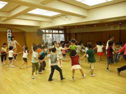 幼稚園の時に楽しんでいた♪「手と手をポンポンポン」と♪「みんなの広場」で友達や先生と手を合わせたり,つないだりして遊びました。みんなとても楽しそうに笑顔がいっぱいあふれていたお招き会でした。