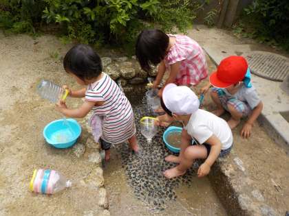 連日の暑さに水が恋しく感じる季節になりました。園庭の一角にある小川に水を流して,水遊びが始まりました。川の中を裸足でペタペタ歩いたり,足をつけると水の冷たさが気持ちよく,バシャバシャと水しぶきをあがりました。