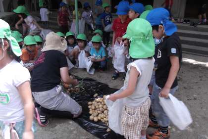 ジャガイモ班の子どもたちは,初めは何をどうすればいいのかわからない様子も見られましたが,土を掘っていくとでてくると聞いてからは,あちこち一生懸命土を掘っていました。「あった〜」と大きな声が聞かれたり,両手でもち切れないほど集めた人もいました。収穫したジャガイモもタマネギも一か所に集めるととてもたくさんで,子どもたちは大喜びでした。袋に入れたものをかばんに入れて幼稚園まで持って帰ってもらうことにしました。