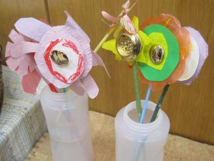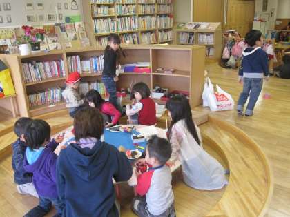 人形劇のグループは、お客さんを意識して公演?の練習をしていました。マイクを使うことで客席にしっかり声が届くようになっていました。お花屋さんの花は一つ一つの手作りがとても愛おしい作品です。ボタンを中央にした花は「かがみばな」です。顔を映すことができます。念願の回転すしコーナーのお客になることができました。絵本室の円形のコーナーを利用した居心地のよいお店でした。帰りにはお土産のお寿司も販売され「食べた人はまた返してください」と言われました。ごっこ遊びがお客さん相手に考えられてきているのはさすがに5歳児ですね。