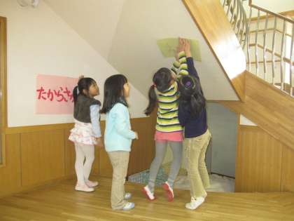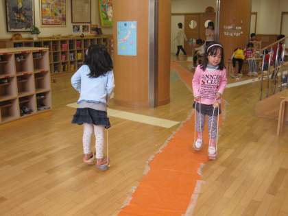 難しいコーナーがありました。「たからさがし」です。1階のどこかにきらきらの宝が隠されているそうです。隠した人がどこに隠したか忘れてしまうのではないかと心配で、「難しいなあ、わかるかなあ」ときいてみると、お客さんが来てから「見ないでね」と言う間に隠すことになっていました。探してほしい「たからさがし」でした。保育室の病院では優しいお医者さんや看護士さんがいました。広いホールでは一本歯げたの子ども達が線路?のところを歩いていました。使いたいときに使い、また片付けておきます。自分の下駄をしっかりそれぞれが管理できるようになっています。