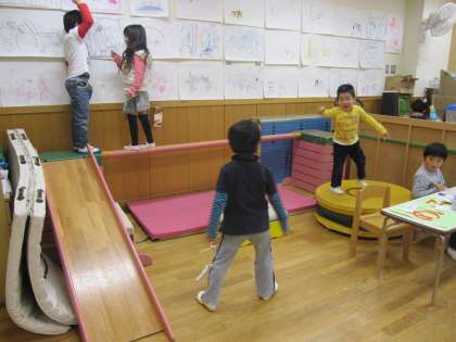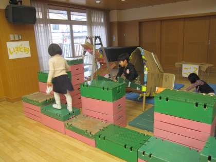 迷路が2箇所できています。年長の刺激をうけてやってみたくなる年中です。年中の迷路はちっとも迷わない「迷路」です。言葉に憧れをもっているのでしょう。遊戯室の年長の迷路には「いきどまり」「ごーる」がありました。一人ずつ入場してもらうために「うけつけ」や「いりぐち」を考え出していました。自分達も遊びを楽しみながら、お客さんが来てくれるのが嬉しい子ども達です。いよいよ明日からは大人のお客さんが大勢来てくれる日です。いいお客さんがたくさん来てくださることを願っています。どうぞよろしゅうおたのもうします。