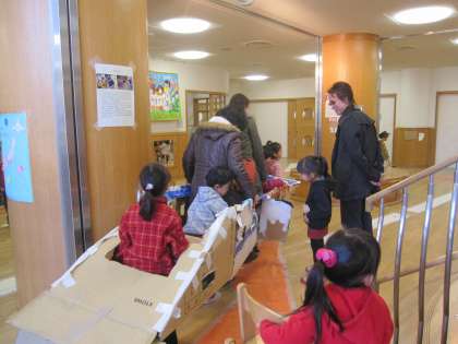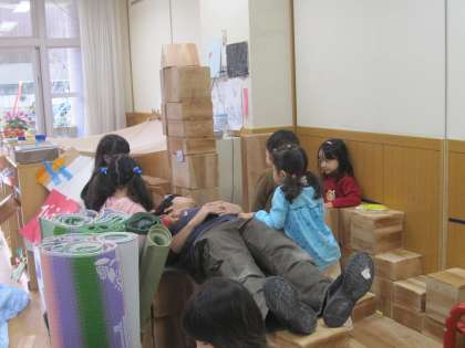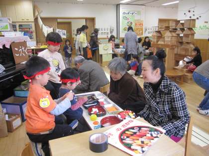 今日も大勢のお客さんで賑わいました。新幹線に大人が乗ると子ども達は運転が軽くてスイスイ進むことができました。年長を真似た寿司屋さんでは、威勢のいい板前さんが注文に応じてにぎってくれます。病院では病状に応じて手当て、処方をしてくれます。場合によっては入院を勧められもします。大人が相手になってかかわることでより楽しく遊びが進みます。本当にみなさんいいお客さんです。子ども達の笑顔がいっぱいです。ありがとうございました。
