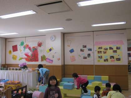 年少の子ども達は保護者の方と一緒に遊ぶのを楽しみにしています。壁にはお出かけ用のかわいいバッグが並んでいます。子ども達の遊びの様子が部屋にたくさん展示された写真で紹介されています。ぜひご覧ください。かいたりつくったりが大好きになっています。年中、年長さん達に自然に寄せてもらっている子どももいます。行動範囲も広くなり好きなことを見つけて遊べる子ども達が増えてきています。幼稚園に来られたら、子ども達からたくさん教えてもらってくださいね。どうぞよろしゅうおたのもうします。