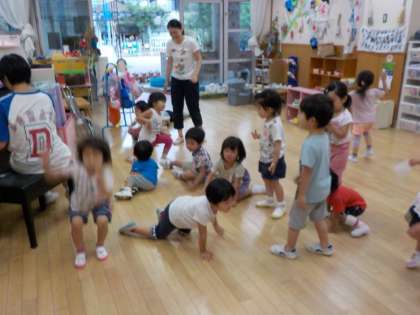 先生が「おやすみなさ〜い」と言うとみんな寝転がってムニャムニャ・・・「おはよ〜!」と声をかけるとみんな起き上がってお散歩に出掛けます。「わたしはヘビさん」「チョウチョもいるよ」と嬉しそうになりたいものになって,自分なりに表現しながら遊んでいます。