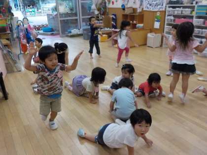 3歳児の保育室では,ピアノのリズムに合わせて子どもたちが好きなものになって表現遊びを楽しんでいます。ジャンプの音楽に合わせてカエルになったり,保育室で飼っているカタツムリやカブトムシになったりしています。表現の仕方はそれぞれですが,一人一人の表現する姿を認め,大事にしています。