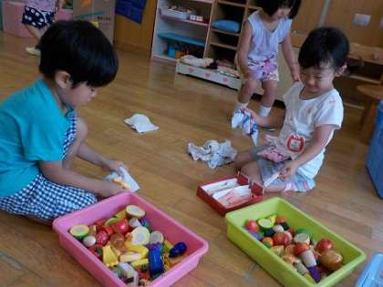 電話にしたり組み合わせて剣にしたりしていた大きなブロックやままごとで美味しいごちそうを作っていたお皿やフォークやスプーンなど,一学期の間たくさん遊んでいたおもちゃを綺麗にしました。子どもたちは「わあ!ピカピカになった!」「みて!こんなに雑巾黒くなったよ!」と掃除までも楽しんでいました。