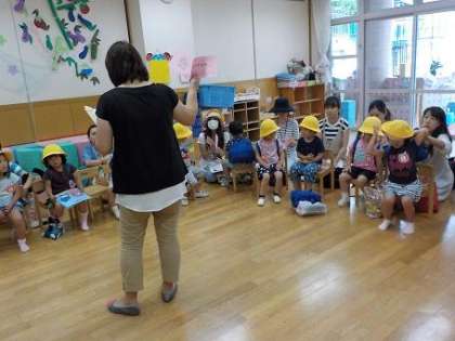 園長先生からは,中京もえぎ幼稚園が15歳になったんだよ,というお話を聞きました。そして,幼稚園は6つの幼稚園が1つになってできたことも,それぞれの幼稚園の写真を見ながら聞きました。そして,「どうやってお祝いしたら幼稚園が喜ぶか考えといてね」と話をしてくださいました。みんな,夏休みの間に考えておいてくださいね。